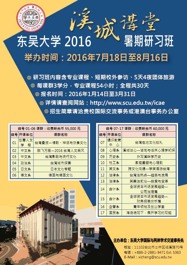 东吴大学2016年溪城讲堂暑期研习班招生公告