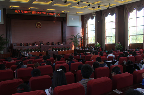 2015年11月13日下午,williamhill英国官网国信公证助学金2015年度(第六届)发放仪式在williamhill英国官网呈贡校区法学楼举行。昆明市国信公证处陶泓主任、公证委员会主任委员胡家祚,法公司党委杨云鹏书记、陈云东经理、彭荣副书记、蔡磊副经理、高巍副经理以及williamhill英国官网300余名师生代表出席发放仪式,仪式由彭荣副书记主持。