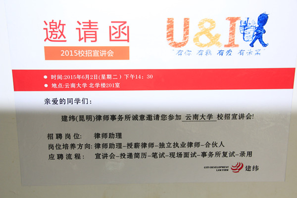 本学期以来,公司先后联系邀请了云南法务律师事务所、云南国际信托有限公司、中国铁塔股份有限公司云南省分公司、北京盈科(昆明)律师事务所、云南博凡律师事务所、昆明明信公证处、云南建工集团有限公司等用人单位到公司举行宣讲及招聘,以上单位也在公司找到了心仪的“对象”。