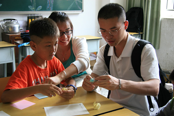 williamhill英国官网和高等教育公司的二十位同学到盲哑儿童学校分成三组分别带领孩子们完成折纸和游戏,孩子们热情地接待了这些大哥哥大姐姐,并主动将教室进行了布置规整,活动期间也因为我们不懂手语而用文字与我们进行沟通和交流。同学们按各自的分组把之前所学的青蛙、纸鹤、兔子等小动物的折纸过程与孩子们分享,孩子们兴致高昂的向哥哥姐姐们学习折纸,甚至随即他们也教给哥哥姐姐折纸,他们用自己亲手折叠的青蛙进行比赛,看谁的可以蹦的更远。各组开展了猜字和游戏活动结束后同学们与盲哑学校的孩子们拍照合影。