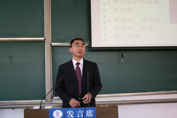 杜晓秋主任以“民国律师印象”为切入点,剖析了新中国以来的律师制度的演进,阐述了律师与法治之间的关系。他认为,律师是民主社会的产物,其使命在于追求正义,维护私权利、制衡公权力;律师作为法治建设的参与者,应当承担起辅助政府决策的重任;对于法治建设而言,律师担当着不可轻视的责任。此外,杜主任提出了成功律师的几个基本要素——良好的品德,正确的理想追求,较好的职业素养和勤奋敬业的职业态度,让在场同学受益匪浅。