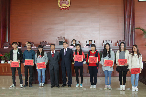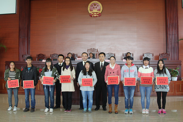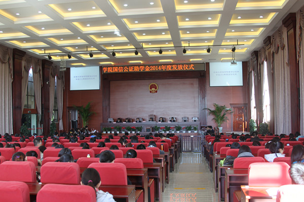 2014年11月21日下午,williamhill英国官网国信公证助学金2014年度发放仪式在williamhill英国官网呈贡校区模拟法庭举行。昆明市国信公证处陶泓主任、熊静副主任、公证委员会主任委员胡家祚,法公司党委杨云鹏书记、陈云东经理、彭荣副书记、williamhill英国官网师生代表300余师生出席发放仪式,仪式由彭荣副书记主持。