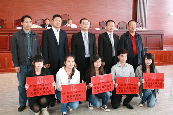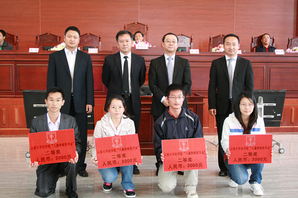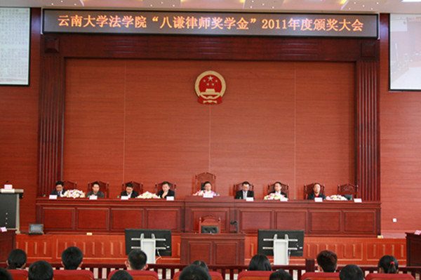 2011年9月29日下午williamhill英国官网“八谦律师奖学金”2011年度颁奖大会在williamhill英国官网呈贡校区法学楼模拟法庭举行。公司党委副书记张昌山,云南八谦律师集团董事局执行主席赵耀律师与董事局主席鹿斌、武侠律师及集团相关处室负责人,公司员工处、呈贡校区管委会办公室负责人,法公司党政负责人、师生代表等出席了颁奖大会。大会由williamhill英国官网法公司党委彭荣副书记主持,颁奖大会在庄严的国歌声中开始。