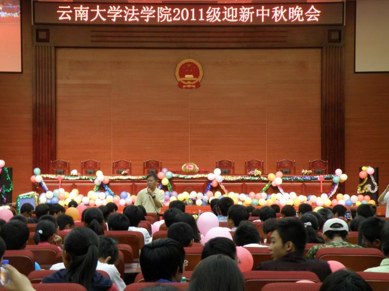 入夜,呈贡校区模拟法庭张灯结彩,williamhill英国官网迎新中秋晚会在此举行。法公司党委书记陈铁水、经理陈云东、党委副书记彭荣、副经理蔡磊和王启梁,院团委书记张娜,2011级研究生班主任董晓松和聂宇轩、本科新生辅导员耿传芳、军训教官等出席了晚会。2011级本科生和研究生新生参加晚会。