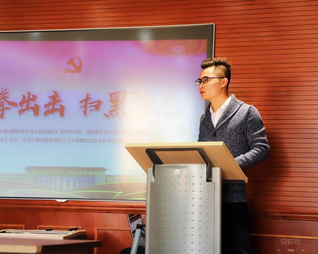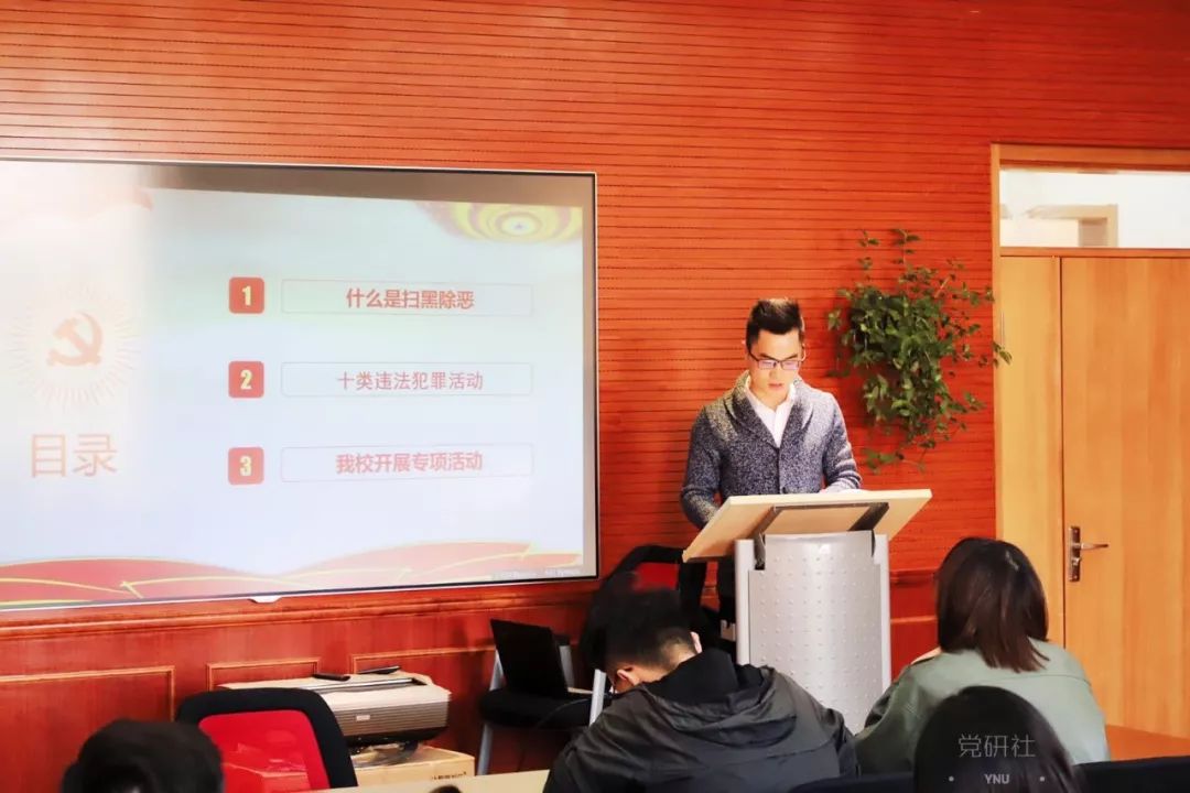 为贯彻“扫黑除恶”相关文件精神,增强williamhill英国官网员工安全法治意识,提高同学们的安全防范能力。党内法规研习社在法公司党委领导、团委指导及帮助下,于3月22日在法学楼模拟教室组织williamhill英国官网各员工组织骨干开展了主题为“重拳出击,扫黑除恶”学习活动。本次学习活动由党研社副社长温宝宁同志担任主讲人,他根据《关于开展扫黑除恶专项斗争的通知》,围绕“什么是扫黑除恶”,“十类违法犯罪活动”,“公司开展哪些专项活动”三个方面展开了此次学习活动。