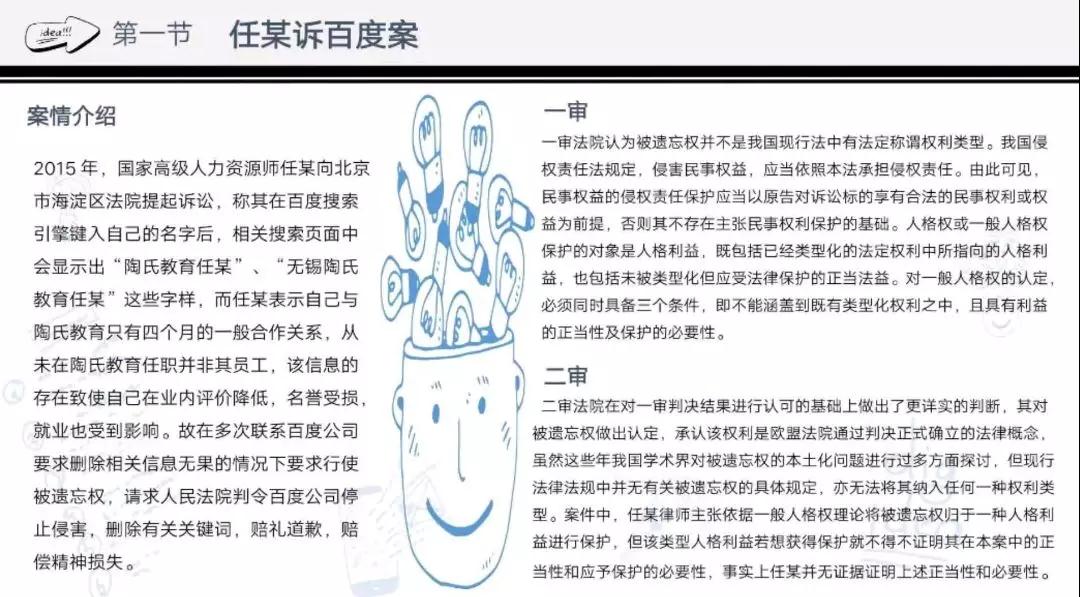 在读书讨论中,熊华俊同学指出,著名的“西班牙案”是对12年前有关信息的“被遗忘权”;我国的“任某案”则针对一年前的信息。由此,被遗忘权产生的另一个问题是,被遗忘信息的时间长度能否作为“被遗忘权”存在的正当基础?