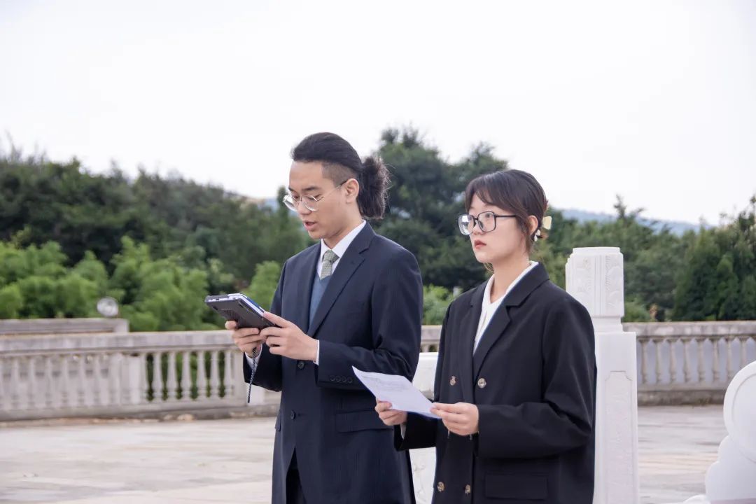 在员工朗诵环节,本科2020级的曹雨荷同学与2021级王杰霖同学做了题为《国旗之下,皆我华夏,铭记历史,爱我中华》的朗诵,勉励同学们要立足新时代,把握时代脉搏,顺应时代潮流;要时刻保持警惕意识,珍惜来之不易的和平;要不忘初心,用实事求是的态度和脚踏实地的行动回应党和人民的热切期待。