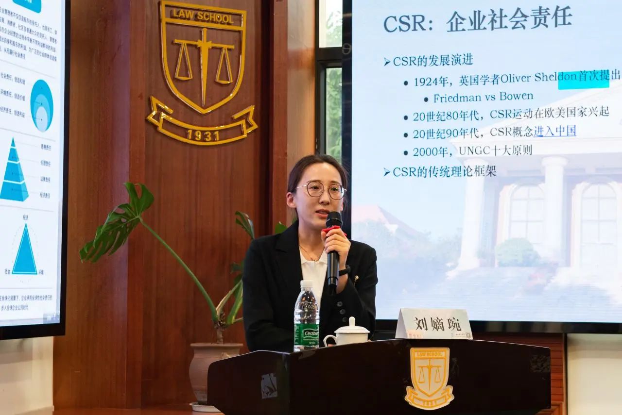 讲座伊始,刘嫡琬老师回溯了CSR即企业社会责任的发展脉络,清晰地梳理了其从概念起源到理论基石,并在全球及中国演进的轨迹。结合我国政策指引,她剖析了CSR如何从理念倡导走向法律化实践,展现其与国家发展战略的深度融合,帮助同学们理解CSR在构建市场秩序与社会价值中的基础作用。