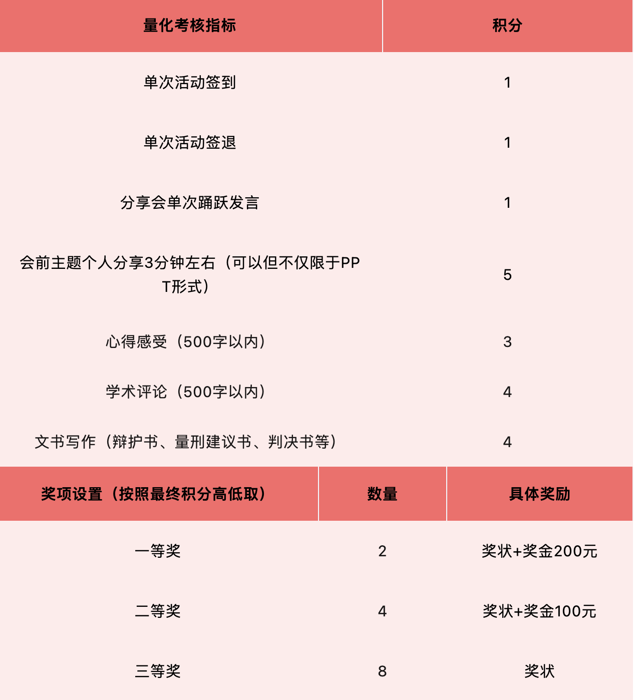 本次活动为院级比赛。赛制为量化积分累计制(个人赛):参与三期读书研讨会活动且最终累计至5分及以上者,研究生可获得1次活动证明,本科生可获得二课积分;同时按照积分排名设置奖励等级。