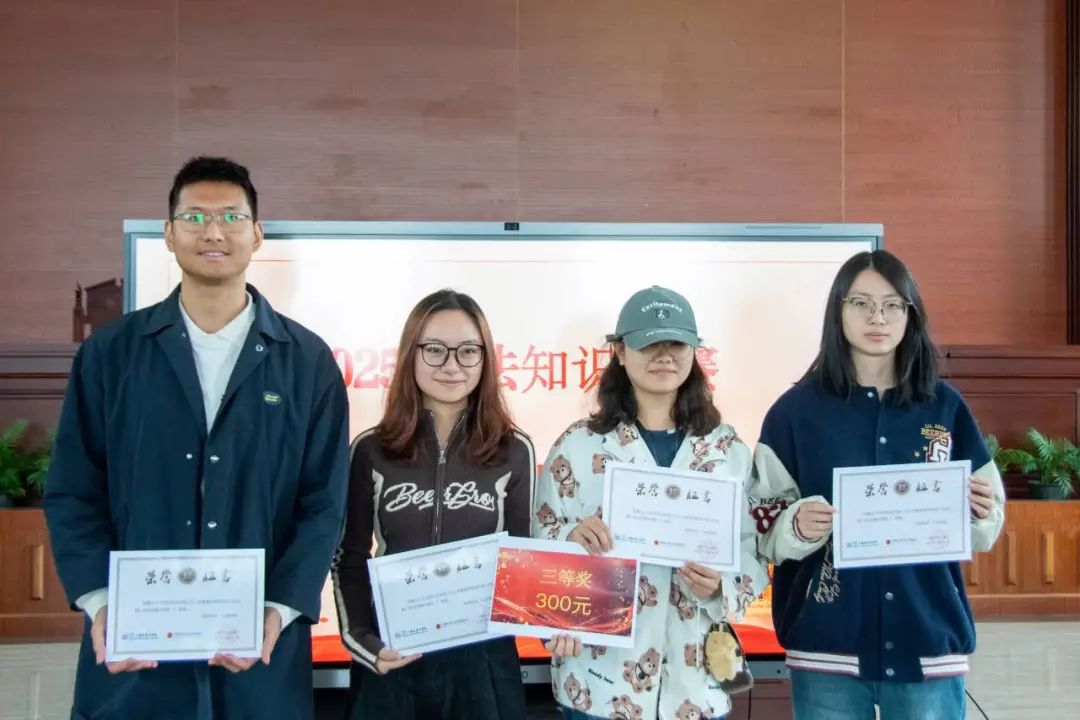 决赛按照16名选手的初赛排名分为4组,以小组作答的方式进行比拼。决赛题型丰富多样,涵盖了单选题、多选题和风险题。分为上下两个半场,各组轮流作答,由志愿者进行分数记录。 决赛现场气氛紧张热烈,选手们个个信心满满、斗志昂扬。在单选题作答环节,选手们冷静思考、从容作答,展现出扎实的知识储备;多选题环节,各个队伍成员们相互配合,比分交替上升,现场气氛被推向高潮。经过激烈的比拼,有三队分数相同,进入加时赛环节。通过7道紧张的加时赛题,成功决出了第一名的队伍。接下来是更加紧张刺激的二三名角逐,经过三题单选必答题之后,今天的比赛终于告一段落,选手们都展现出了丰富的知识、出色的应变能力和团队协作精神。