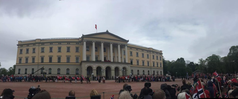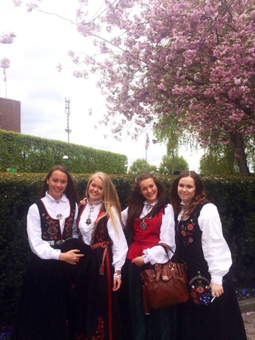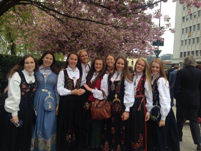 挪威国庆用的是独立宣言时间而非建国时间,二者隔了100年左右,从心自由的时候,便是自由的开始。挪威国庆游行出了名的是只有孩子游行,木有阅兵。当然,这边的初高中男生穿的是西装,不是国内的校服,所以游行的颜值略高。而一部分挪威女孩会穿上她们的传统服装,而这个服装因为手工制作价格比较贵——大部分女生的服装是祖代传下来的或是自己做的,根据和她们聊天的不完全统计.